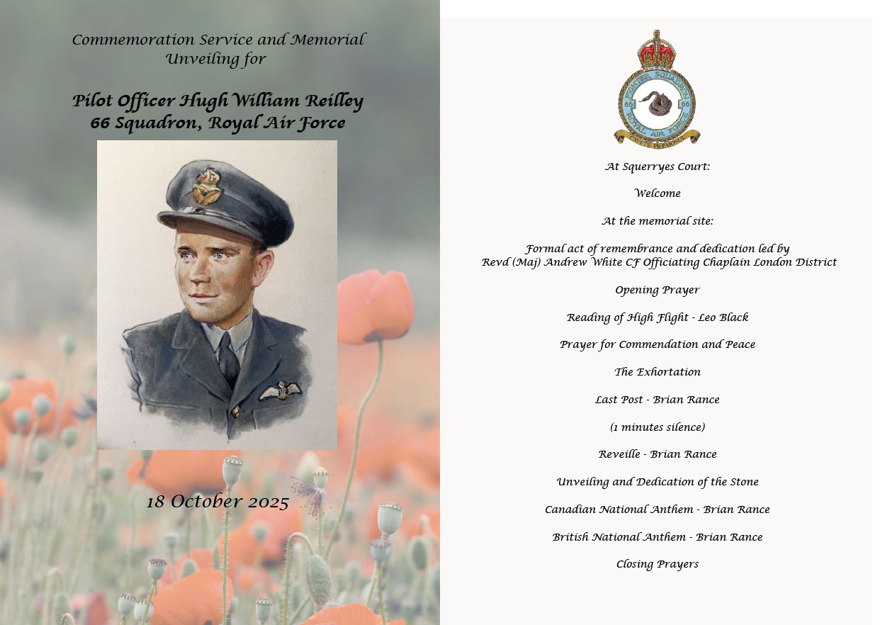 Our thirteenth memorial was dedicated to twenty-two year old Pilot Officer Hugh William Reilley of 66 Squadron on 18th October 2025. The memorial is located on the property of Squerryes Court in Kent, close to where he was killed.